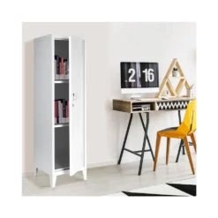 Invitez le design industriel chez vous avec notre armoire vestiaire Estel en mĂ©tal blanche ! Cette armoire est l’Ă©lĂ©ment indispensable Ă votre bureau ou Ă votre chambre Ă coucher ! Elle est idĂ©ale en meuble d’appoint.Son design industriel aux lignes sobres et Ă©purĂ©es lui apporte une vraie touche d’originalitĂ© !Sa structure en acier (Ă©paisseur 0,4 mm) et ses 4 pieds vous garantissent une vraie stabilitĂ© et une vĂ©ritable robustesse.Pratique grâce Ă ses 2 Ă©tagères intĂ©rieures, rangez, classez et organisez toutes vos affaires Ă porter de main ! Ses 2 Ă©tagères vous permettent ainsi une meilleure organisation de vos affaires et vous offrent une capacitĂ© de rangement optimale !1 poignĂ©e.Fermeture Ă l’aide des 2 clefs livrĂ©es.Dimensions totales : Longueur 38,5 cm x Largeur 38,5 cm x Hauteur 137 cmHauteur des pieds : 10 cmModèle disponible en diffĂ©rents coloris sur notre boutique en ligne :- Armoire vestiaire Estel en mĂ©tal blanche- Armoire vestiaire Estel en mĂ©tal grise- Armoire vestiaire Estel en mĂ©tal noir- Armoire vestiaire Estel en mĂ©tal gris clair Retrouvez toute notre collection industrielle Estel sur notre boutique en ligne.