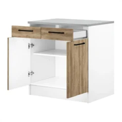 Un meuble pratiqueLe meuble bas MALICE vous séduira par ses grands espaces de rangement et son aménagement bien pensé. En effet, il dispose de deux grandes niches fermées par des portes pleines et agrémentées d’une tablette intérieure ajustable en hauteur. Ce meuble bas possède aussi deux tiroirs dans lesquels vous pourrez par exemple ranger vos couverts ou de petits accessoires de cuisine. Facile à vivre, ce meuble bas de 80 cm de large se nettoie très simplement d’un coup d’éponge. Il peut être utilisé seul ou en complément d’autres éléments de la même collection pour former une cuisine aménagée.Une finition bicolore originaleLa finition de ce meuble bas imitation chêne est mise en valeur par les parties blanches au niveau du plateau supérieur, des côtés et de la base. Avec son coloris boisé intemporel, il convient aussi bien à une cuisine contemporaine que classique, ou même à une pièce d’inspiration industrielle. Les poignées noires sont en PVC mat.
