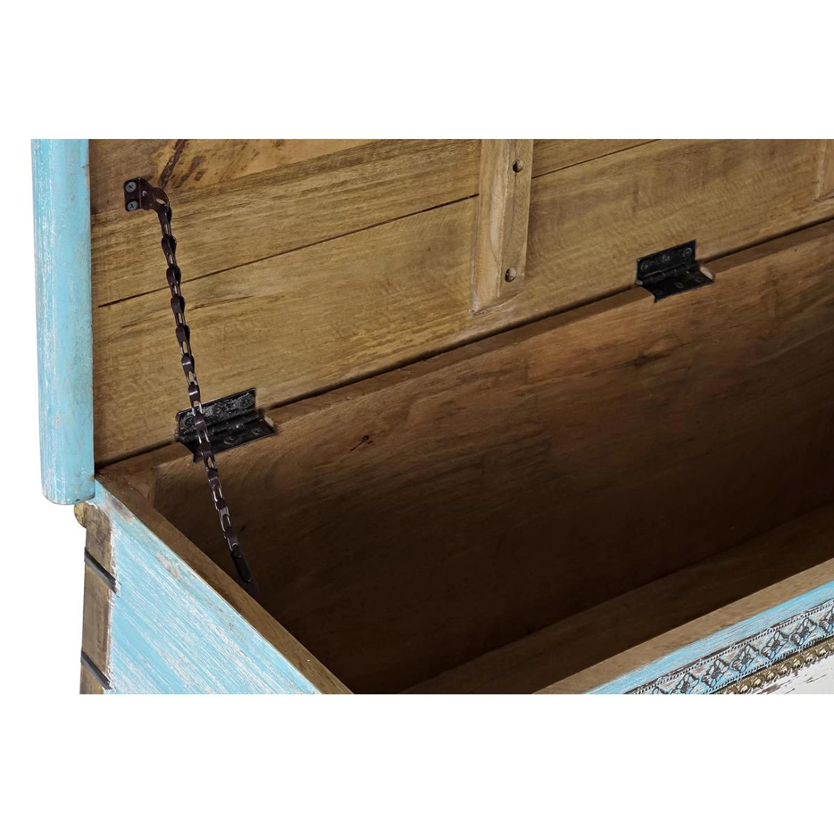 Points forts Pegane Coffre de rangement en bois coloris bleu vieilli et laiton – Longueur 116 x Profondeur 40 x Hauteur 45 cm