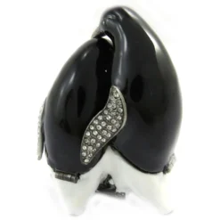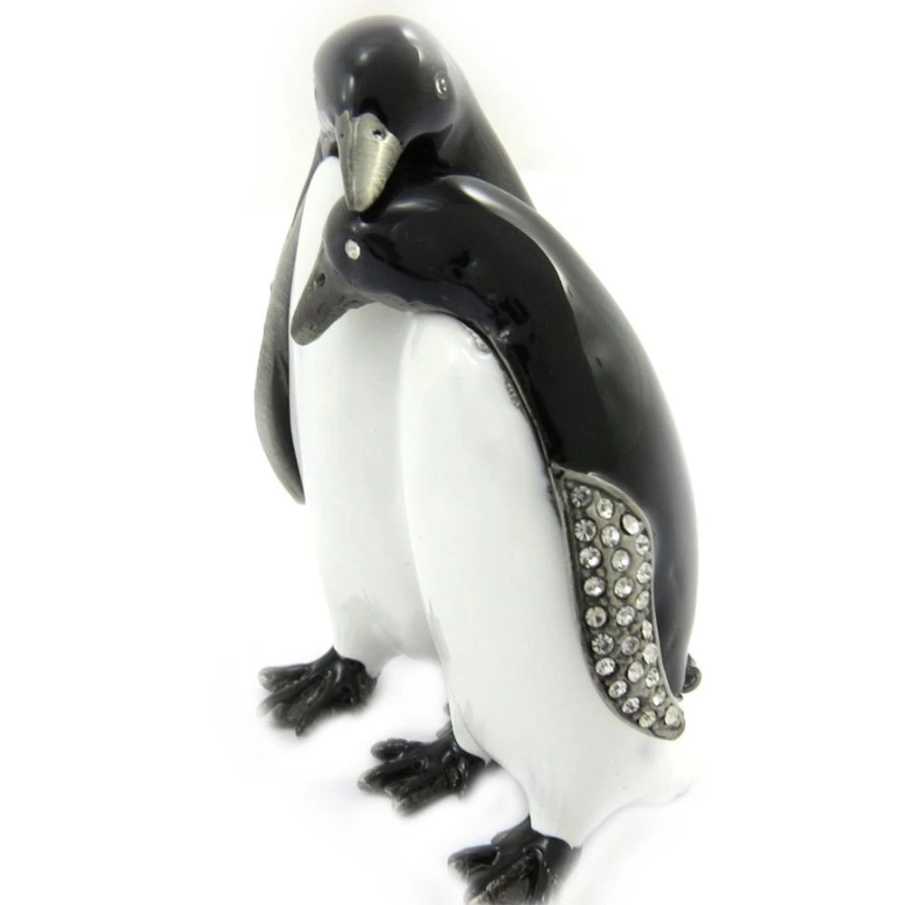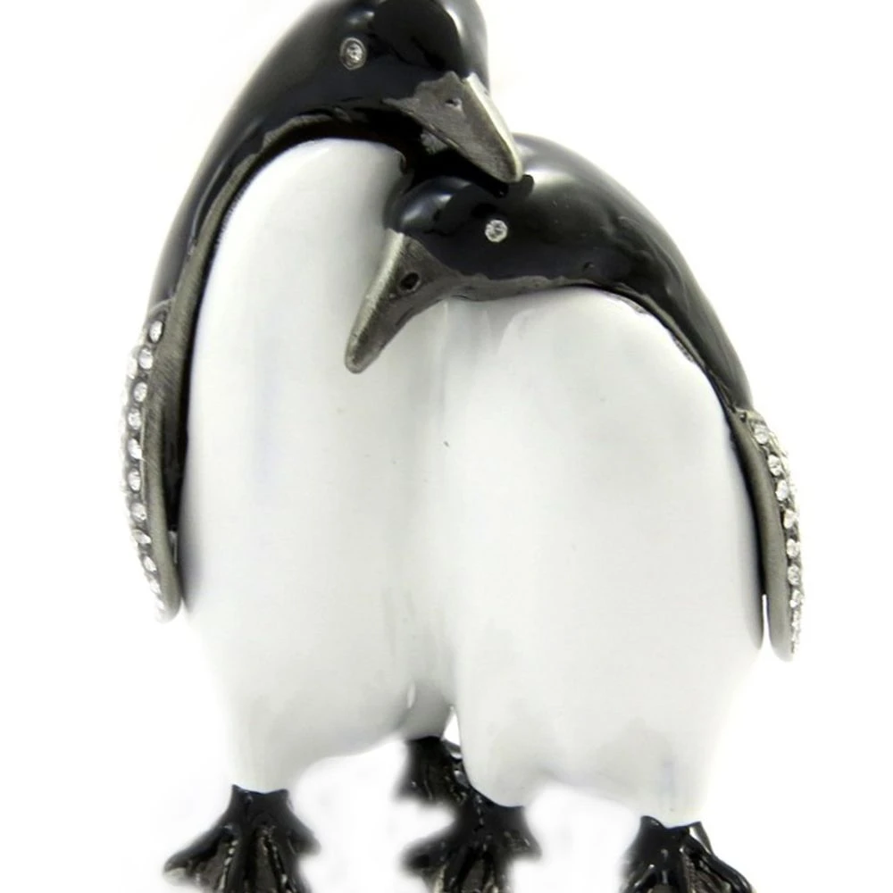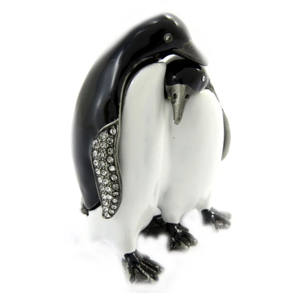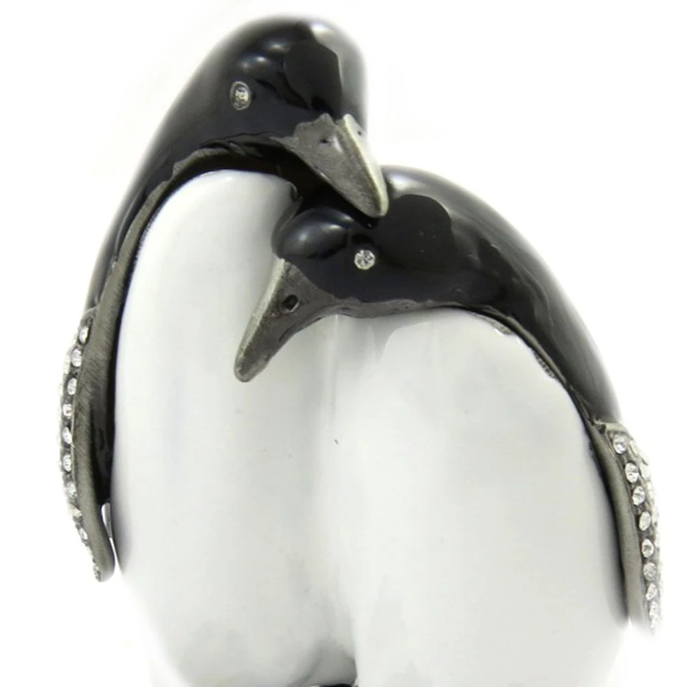 VĂ©ritable bijou que ces boites Ă bijoux en mĂ©tal laquĂ© ‘Couple Pingouins’ incrustĂ©e de cristaux (oxyde de zirconium, utilisĂ© en bijouterie pour fabriquer des imitations du diamant presque aussi brillant et avec la mĂŞme rĂ©sistance). On adore la scène de tendresse et son intĂ©rieur laquĂ© orange ! Hauteur 7 cm. [Ref. L9212]