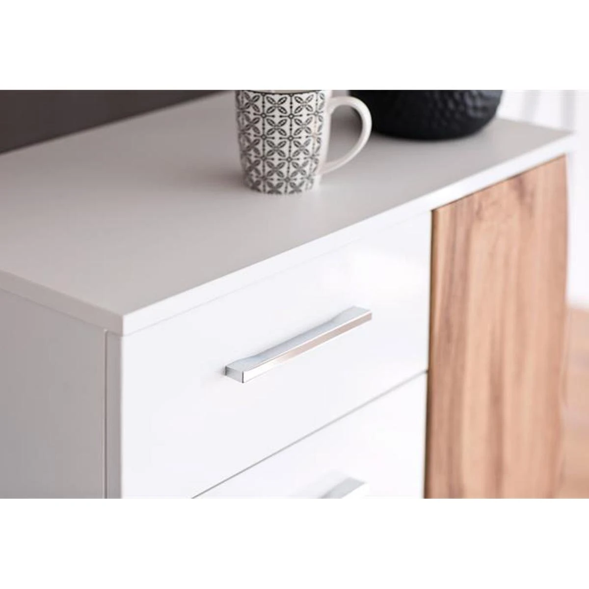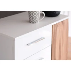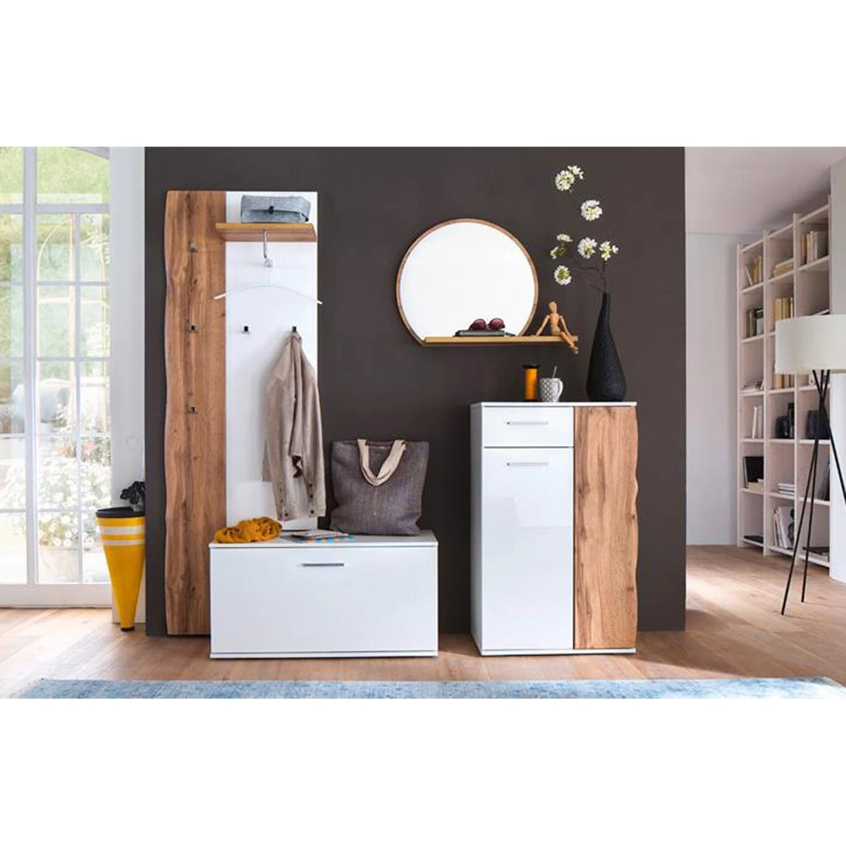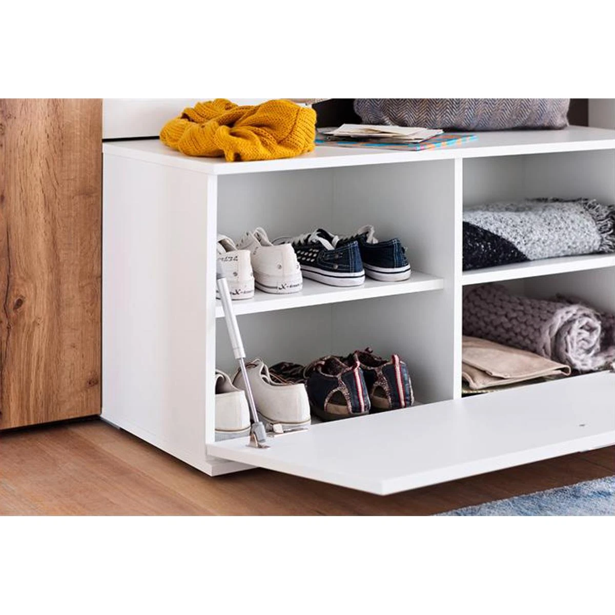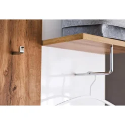 Vestiaire en 5 parties , composĂ© d’une banquette, d’une commode, de deux panneaux muraux et d’un miroir mural. La combinaison de couleurs de laque blanche brillante et de chĂȘne Wotan confĂšre Ă l’ensemble une ambiance Ă la fois noble et naturelle. Avec les poignĂ©es mĂ©talliques robustes et le guidage sous le sol rembourrĂ©, le vestiaire offre des caractĂ©ristiques de haute qualitĂ©. Les nombreux espaces de rangement et options de rangement.