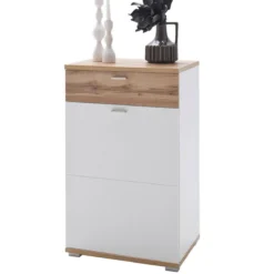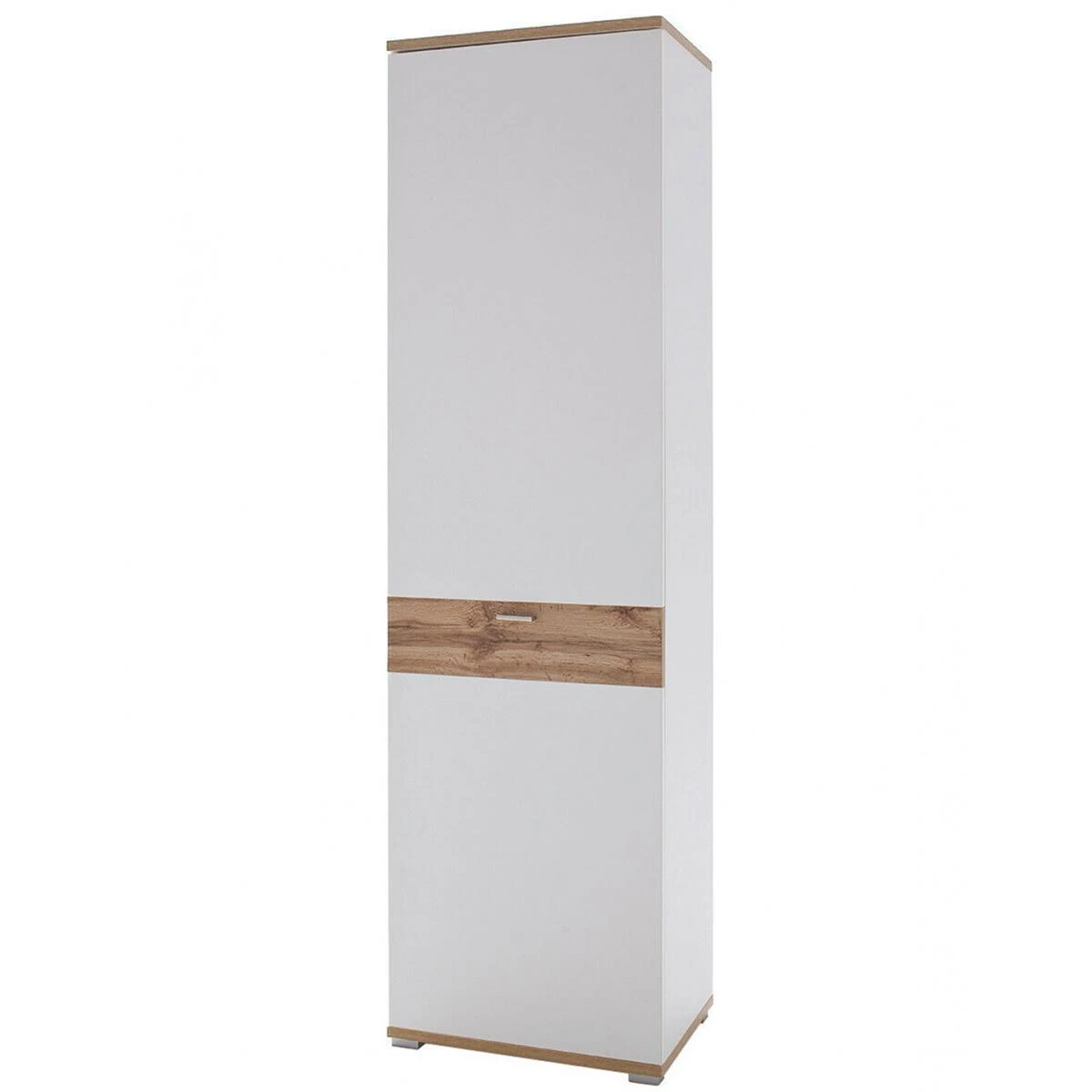 Ensemble de vestiaire 4 pièces , composé d’une armoire, d’une commode, d’un panneau mural et d’un miroir mural. de couleur blanc et chêne Wotan. Surface mélaminée et panneau embouti. Cet ensemble complet offre beaucoup d’espace pour les vestes, chapeaux, chaussures et autres ustensiles…