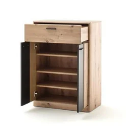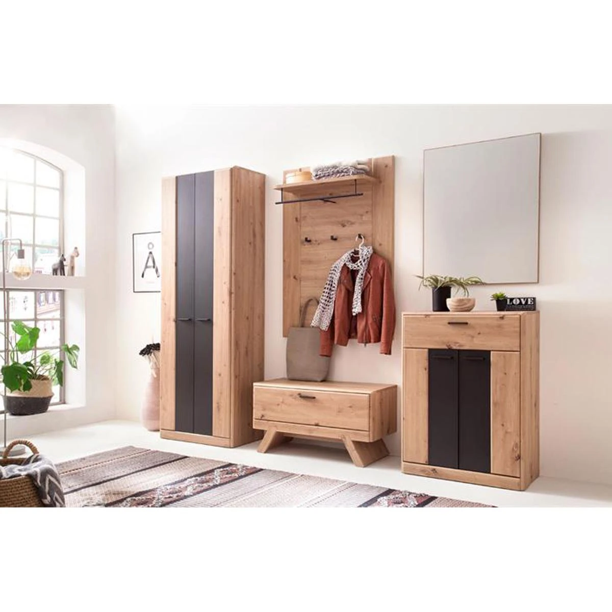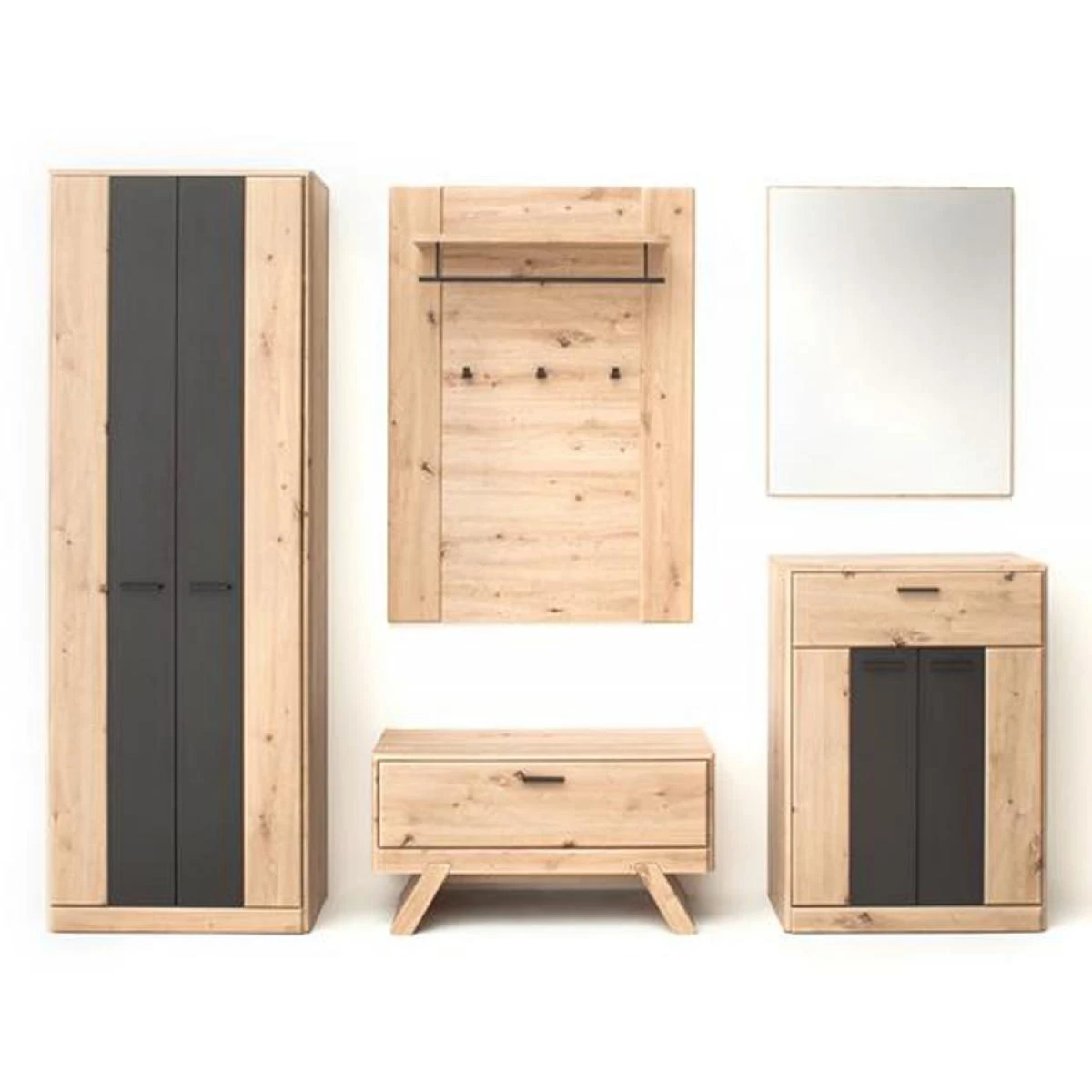 Ensemble séjour 5 élèments coloris chêne, composé de : panneau mural , vitrine, armoire, banc et miroir. Fabriqué en panneaux de particules de haute qualité. C’est une solution de rangement parfaite et vous permettra de garder votre entrée soigneusement rangée.