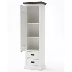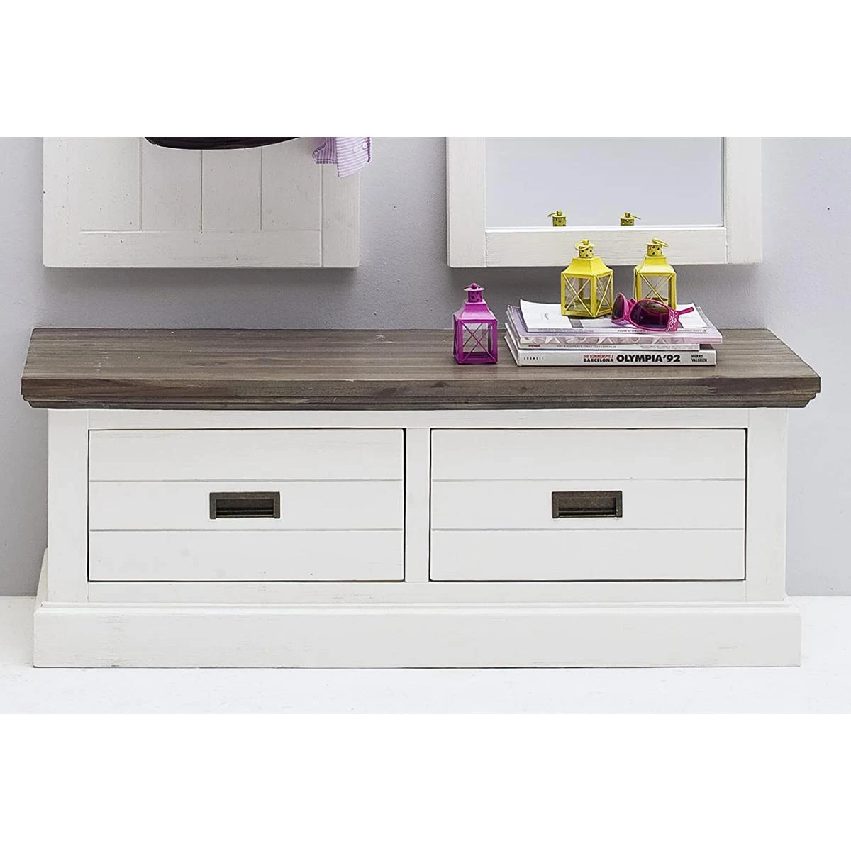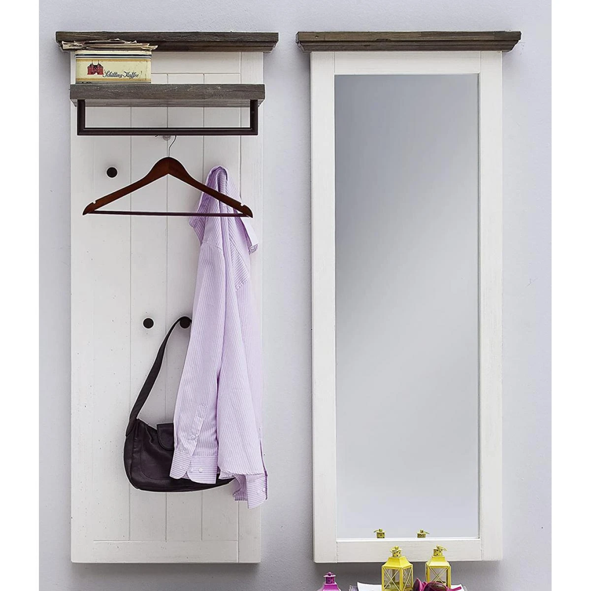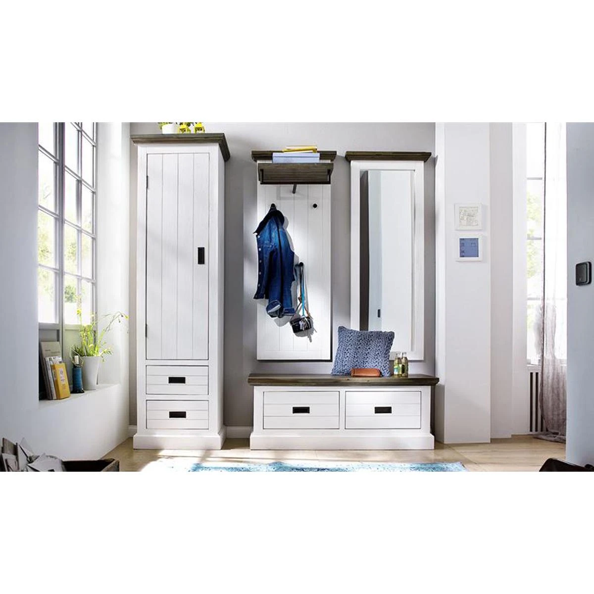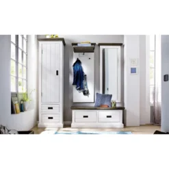 Avec cet ensemble de vestiaire évoquez le charme d’une maison de campagne de rêve dans votre couloir. L’ensemble 4 pièces se compose d’une armoire 1 porte avec tiroirs, qui offre de la place pour vos vestes, manteaux et sacs, ainsi qu’un panneau mural pour les vestes de vos invités ou enfants. De plus, le vestiaire contient un banc pratique avec des tiroirs pour les chaussures et un long miroir dans lequel vous pourrez examiner votre tenue. Les meubles individuels sont tous en acacia partiellement massif. Les surfaces peintes en brun basalte et principalement en blanc offrent un joli contraste.