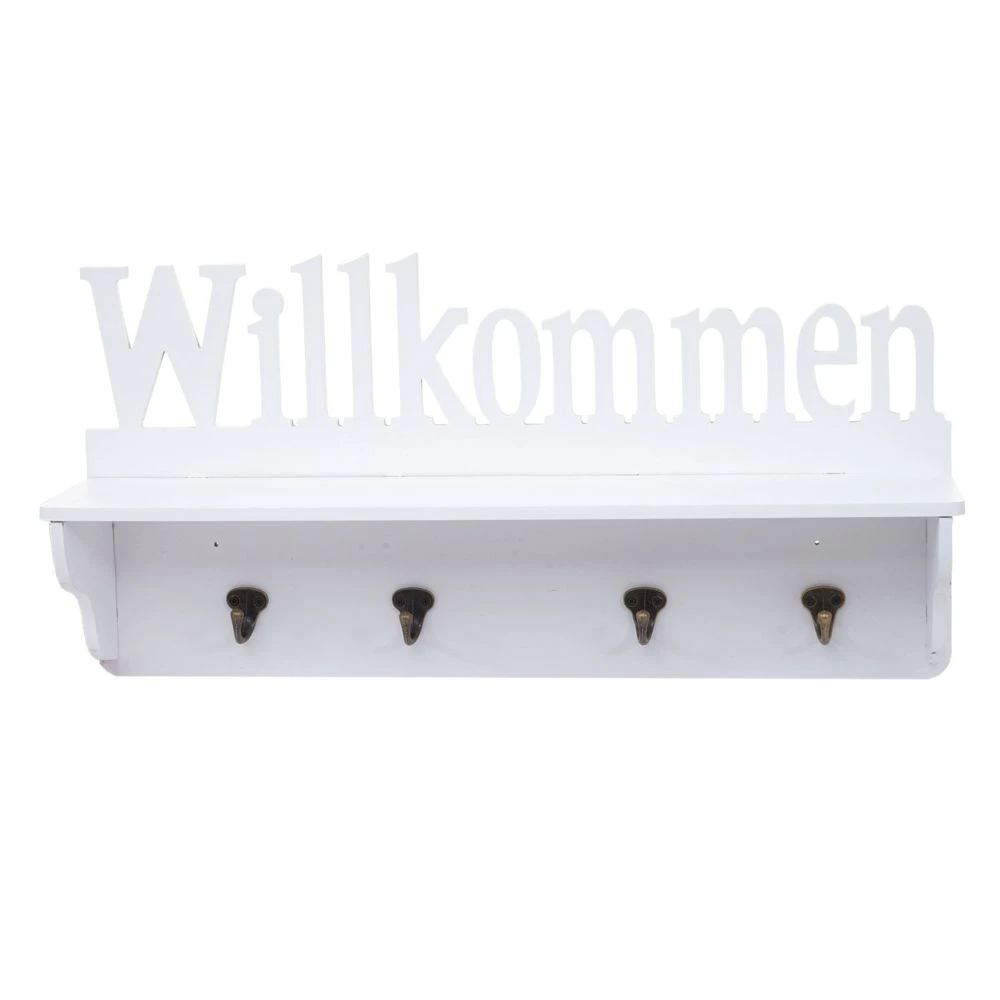 Garderobe murale HWC-D41 Willkommen, planche vestiaire, étagère, 4 crochets massifs 30x60x13cm ~ blanc