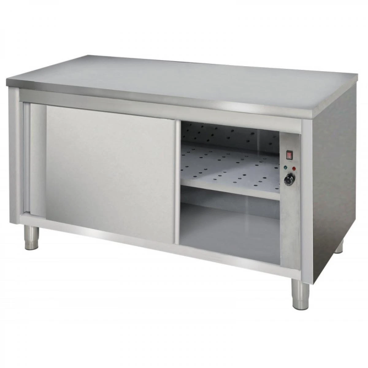 Meuble chauffant inox Ă©quipĂ© de portes coulissantes, d’un plan de travail très stable et d’une Ă©tagère intermĂ©diaire perforĂ©e. Il comprend des pieds rĂ©glables en tube rond de 50 mm de diamètre sur vĂ©rin. Il est idĂ©al pour servir de plan de travail en cuisine tout en conservant les ingrĂ©dients et plats Ă bonne tempĂ©rature. Chauffage ventilĂ© – TempĂ©rature jusqu’Ă 90°C rĂ©glable. Plusieurs longueurs disponibles. Dimensions : P 600 x H 850/900 mm | Puissance : 2500 w – 230 V/1/50 Hz Poids en fonction de la longueur (kg) : 58 – 64 – 68 – 74 – 87 – 87