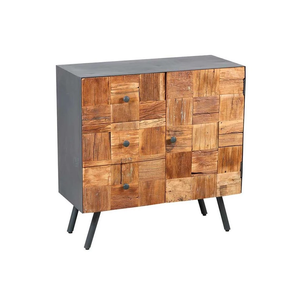 Ce meuble de complĂ©ment Ă la dimension optimisĂ©e met en oeuvre du bois massif de Palissandre vieilli et une structure faite d’Ă©lĂ©ments en acier.