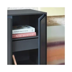 Corps et panneaux de portes sont revêtus d’une laque gris foncé, ce meuble est mis en volume par des encadrements laque bleu foncé.