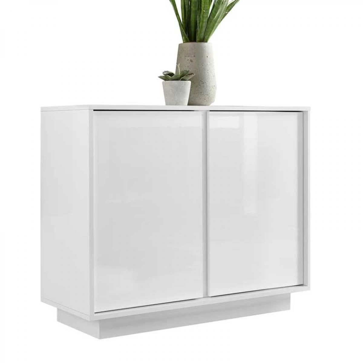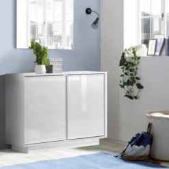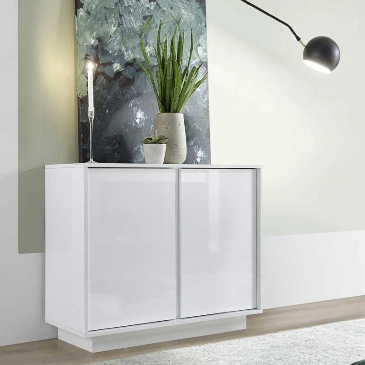 Combinaison d’un design contemporain et d’une finition laque blanc brillant pour ce meuble d’entrée 2 portes au look minimaliste.