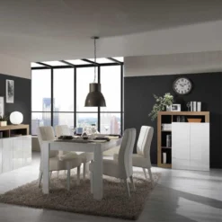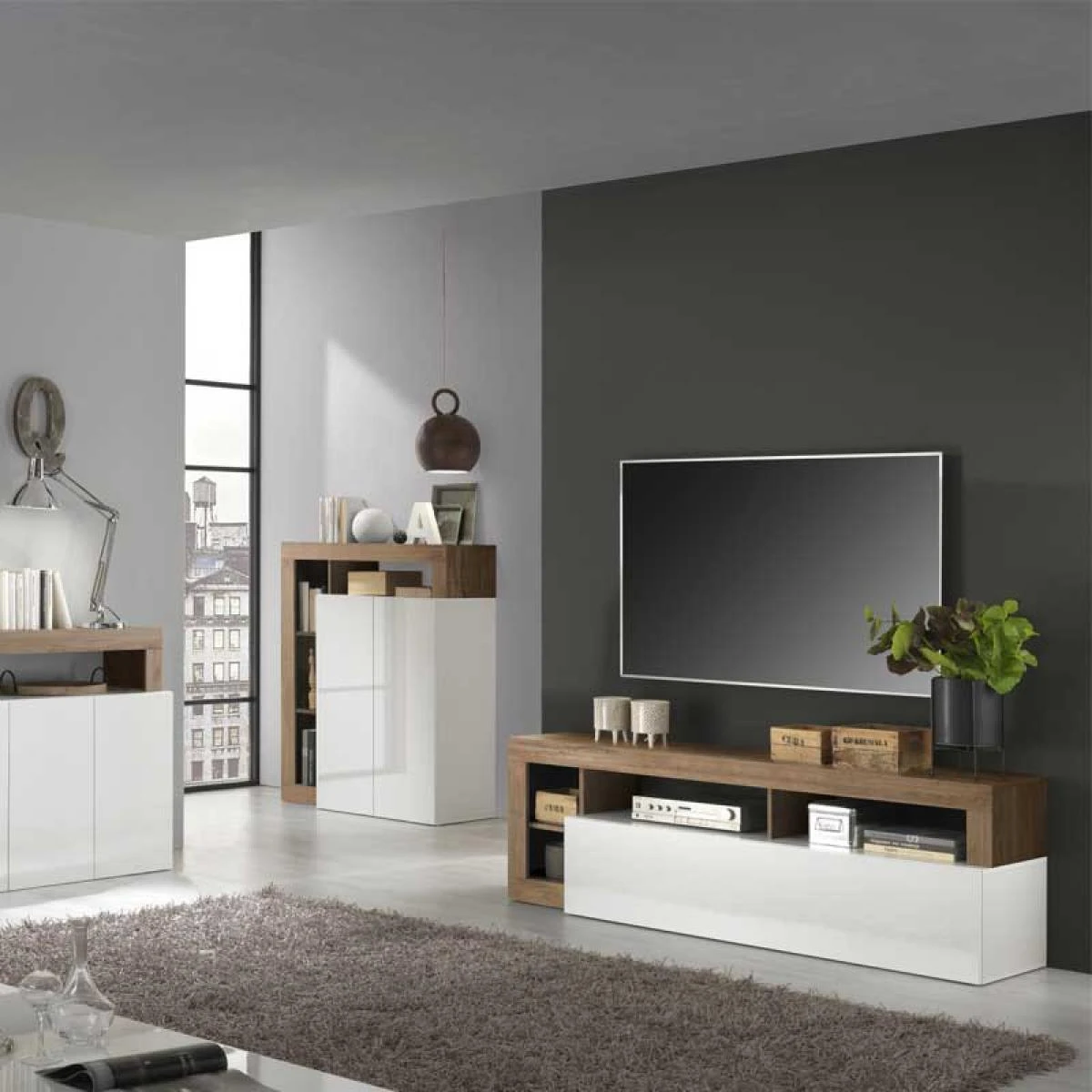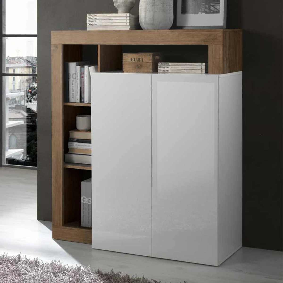 La belle finition Chêne noisette au rendu très probant se marie ici à une laque Blanc brillant, vous pourrez ainsi facilement associer ce meuble de rangement à un mobilier contemporain hétérogène ou a du mobilier plus classique.
