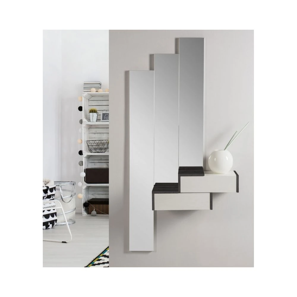 Cette belle console d’entrĂ©e Ă suspendre pourra facilement se loger dans votre entrĂ©e et vous permettra de ranger vos petits objets utiles. Ce meuble d’entrĂ©e est accompagnĂ© d’un joli miroir moderne en escalier.