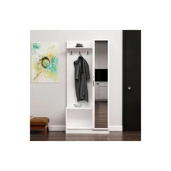 Ce meuble d’entrĂ©e de style contemporain propose un mariage de finition bois blanc mise en contraste par une finition bois noir.
