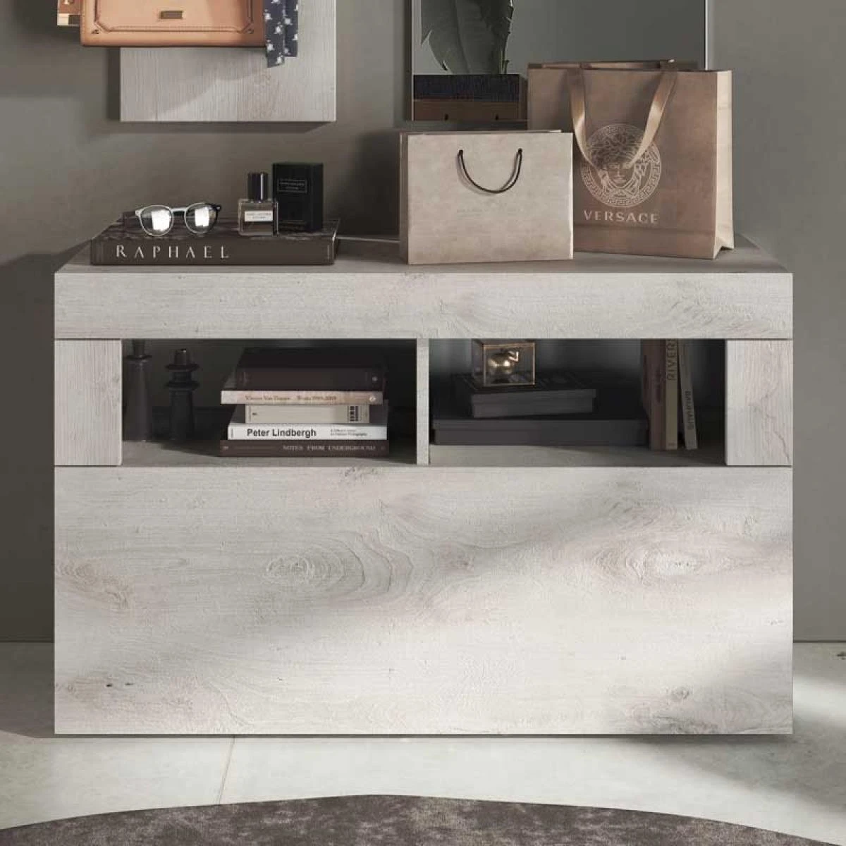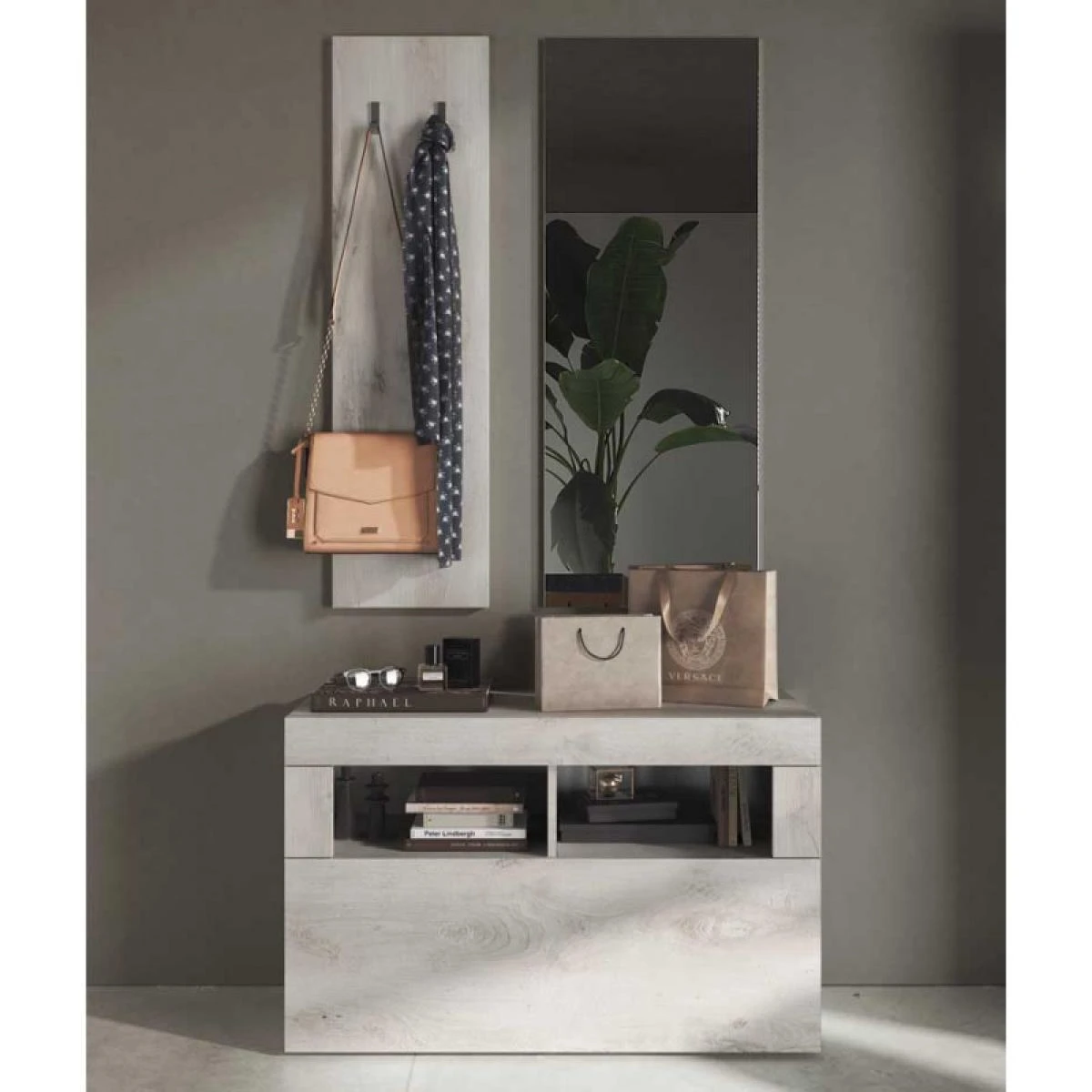 Design contemporain et très belle qualité perçue d’une finition Pin blanc au veinage plus vrai que nature pour ce meuble d’entrée range-chaussures.