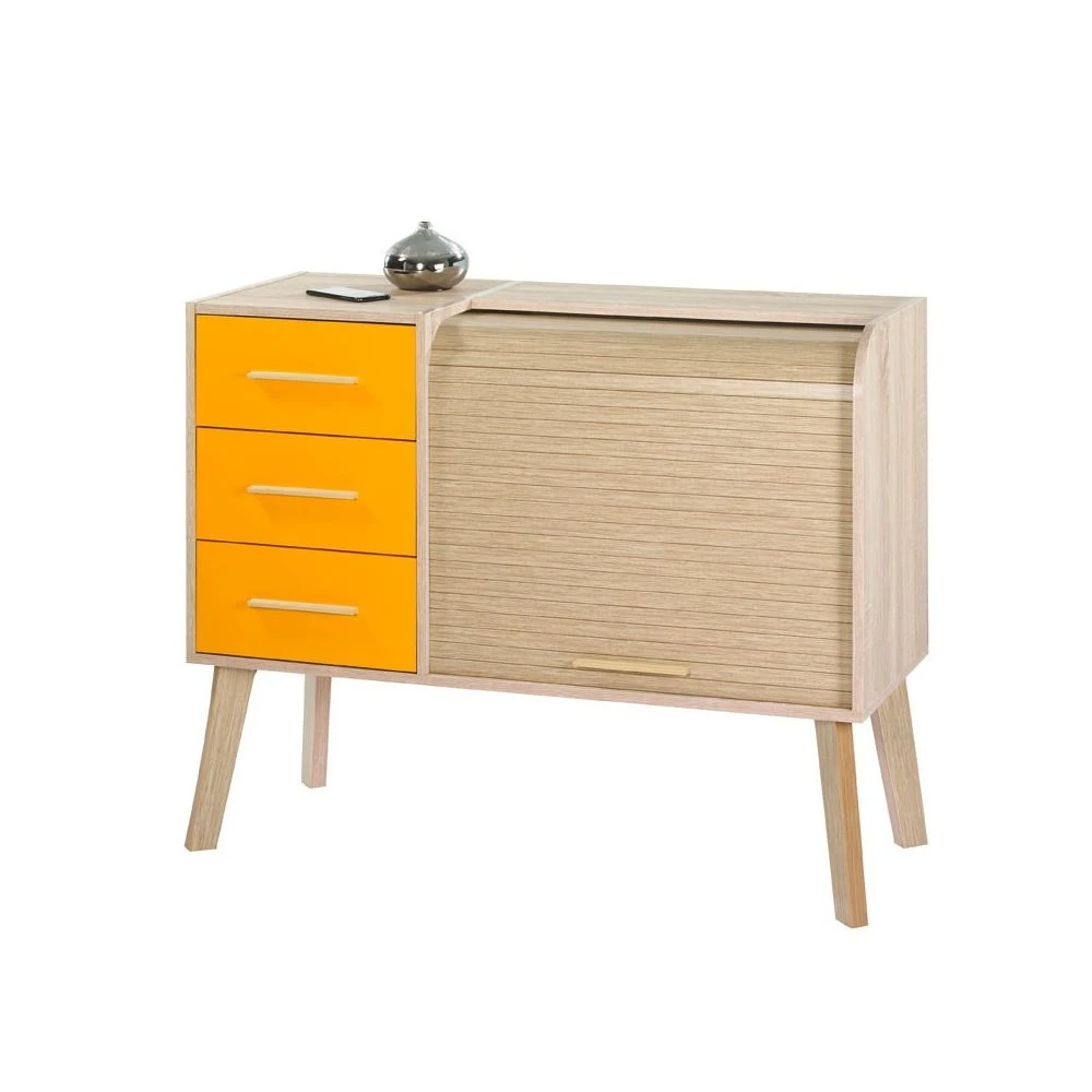Les belles proportions proposent piétement, corpus, rideau bois clair et 3 tiroirs mandarine.