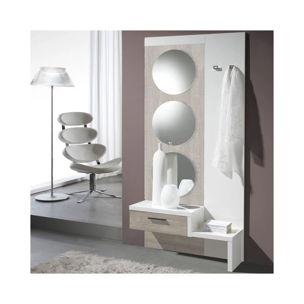 Ce meuble d’entrée est composé d’un tiroir décor chêne clair, des trois miroirs ainsi que de deux porte-manteaux en faisant le meuble idéal et pratique qui vous manque dans votre entrée.