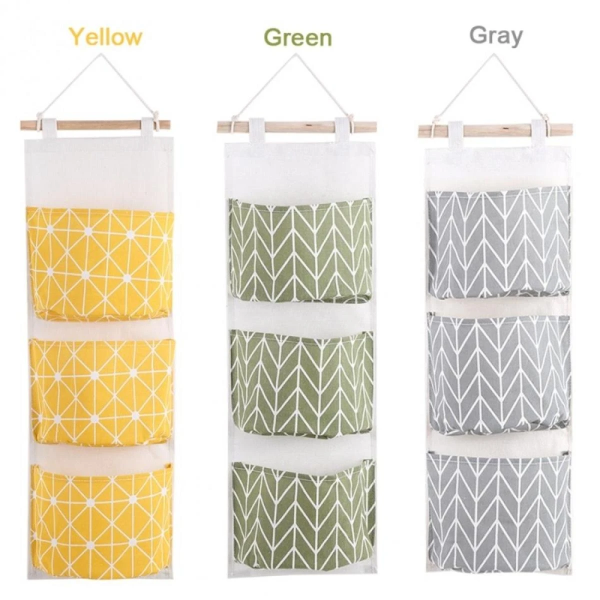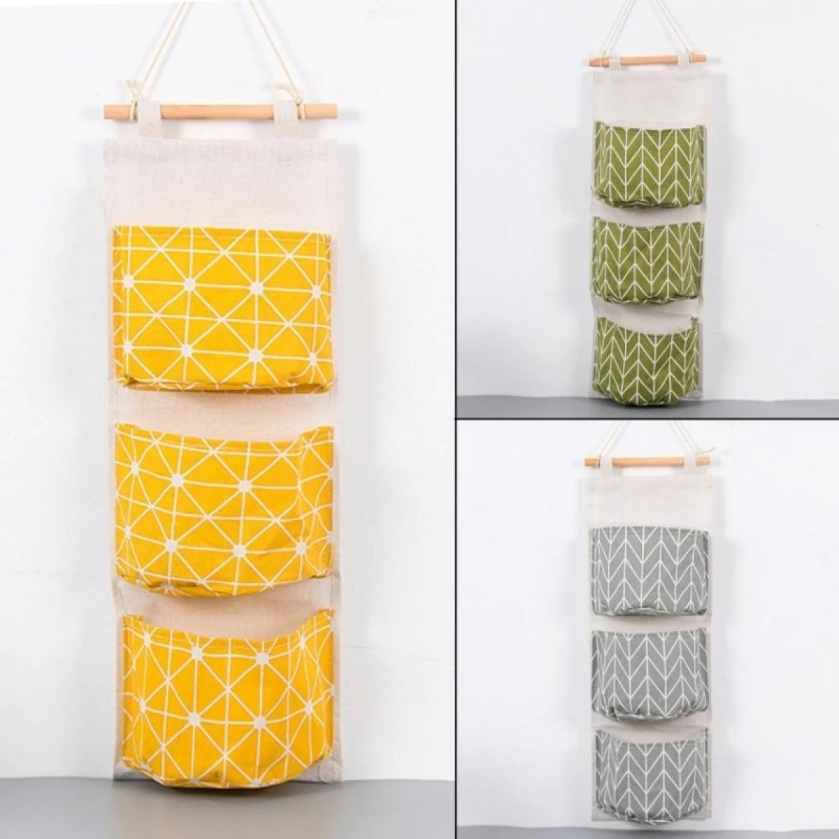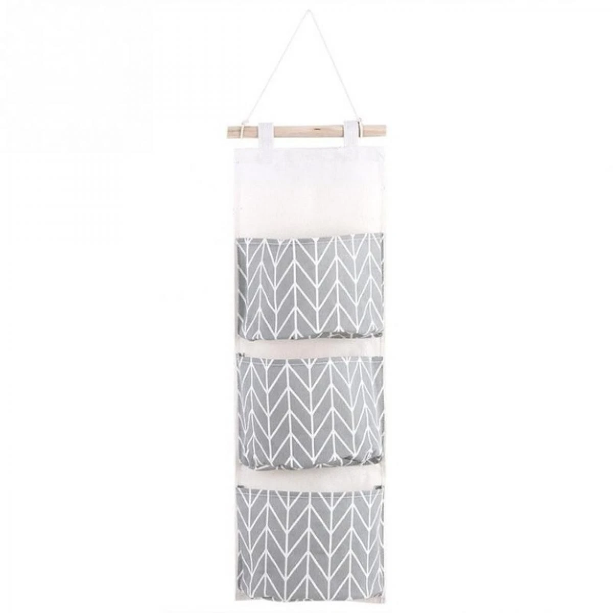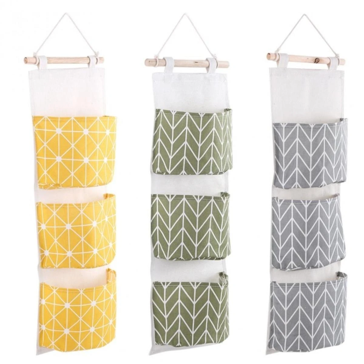 Sac de rangement mural en lin avec 3 poches, pochette pour chambre Ă coucher, sac de rangement pour la maison, poche (Gris)