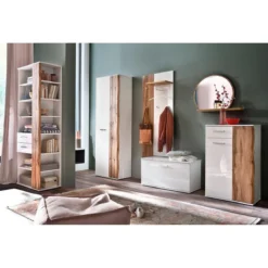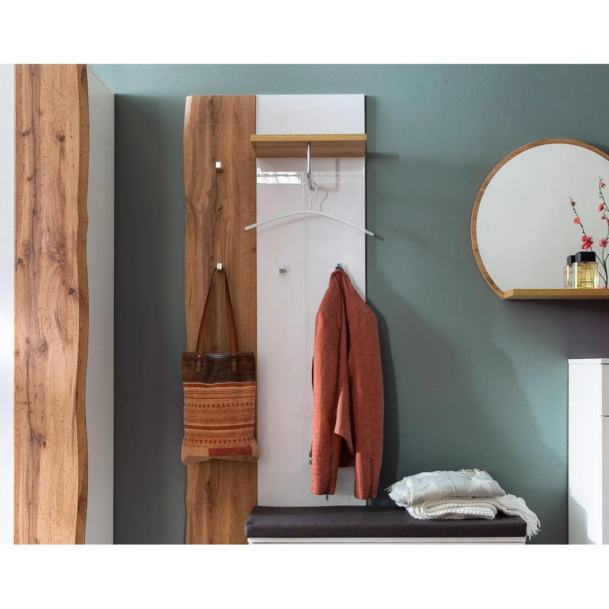 Ce panneau de vestiaire pratique a un look magnifique et offre beaucoup d’espace pour vos vestes, chapeaux et Ă©charpes. La combinaison de la laque brillante blanche noble et du chĂŞne naturel de Wotan est très belle. Cela crĂ©e une ambiance Ă©lĂ©gante et en mĂŞme temps naturelle dans votre couloir.